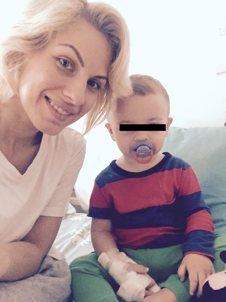Mesajul este însoţit şi de o poză cu băieţelul de 1 an şi jumătate, care are o mânuţă bandajată.