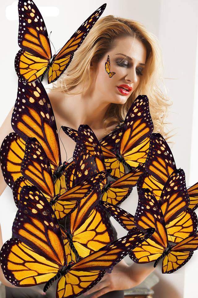 Este vorba despre Julia Jianu. Se pare că artista are o pasiune aparte pentru fluturi, altfel nu ne putem explica de ce fotografia abundă în multicolorele insecte. Fluturi pe sâni, fe faţă, pretutindeni. Prietenii virtuali nu au fost prea încântaţi de modificări, mai ales că sub colajul photoshopat, cântăreaţa pare a fi topless.
