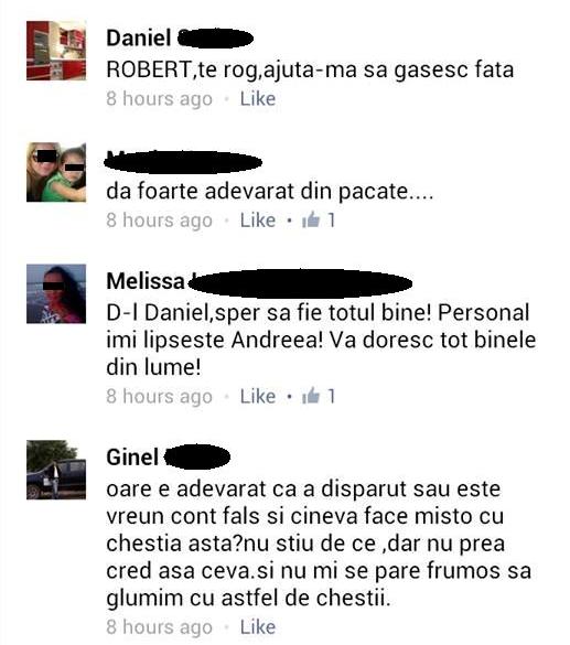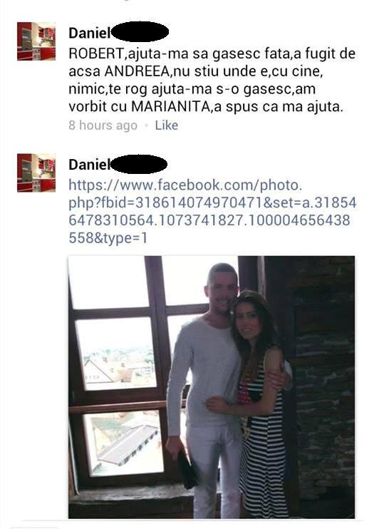 "Robert ajuta-ma să găsesc fata, a fugit de acasă Andreea, nu ştiu unde este, cu cine, numic, te rog ajută-mă s-o găsesc. Am vorbit cu Marianita, a spus că mă ajută", spune Daniel, cel care pretinde că este tatăl Andreei.