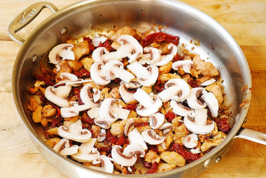 Într-o tigaie mare se încălzeşte uleiul de măsline şi se adaugă carnea de pui şi roşiile uscate. Se călesc la foc mediu, un minut. Se adaugă ciupercile şi se lasă la foc timp de două minute, până când puiul este rumenit şi ciupercile înmuiate. Apoi se adaugă usturoiul, sosul de busuioc, laptele şi sarea şi se lasă la fiert până cănd sosul scade şi îngredientele sunt fierte. Fierbeţi pastele conform instrucţiunilor de pe ambalaj, după care adăugaţi-le peste sosul din tigaie. La final presăraţi deasupra busuioc proaspăt. Se servesc imediat.