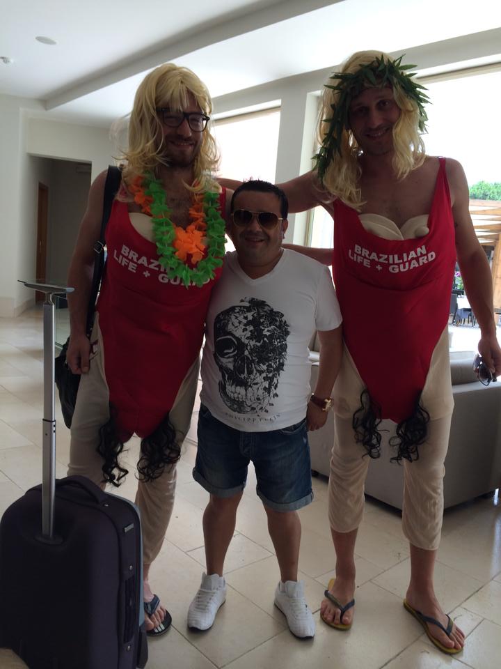 Artistul era pe picior de plecare şi, înainte să-şi ia bagajele, s-a aşezat la o poză între doi prieteni deghizaţi în femei. Cu peruci blonde pe cap, în costume de baie imense şi roşii, de salvamari "sexy", cu sâni de jucărie cu "sfârcurile" pe afară şi chiar cu "păr pubian", cele două "domnişoare" râdeau şi-l ţineau pe Adi Minune pe după gât. Manelistul este îmbrăcat casual, cu o pereche de pantaloni scurţi din denim şi un tricou alb. Minune a primit câteva sute de like-uri la această imagine şi o mulţime de comentarii.