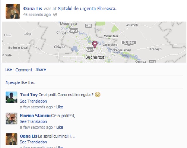 În urmă cu câteva minute, Oana Lis a semnalat pe contul de Facebook că se află la Spitalul de Urgenţă Floreasca. Blonda nu a oferit mai multe detalii prietenilor virtuali, însă se poate ca starea de sănătate a lui Viorel să se fi înrăutăţit. Prietenii virtuali aşteaptă cu sufletul la gură noi informaţii.