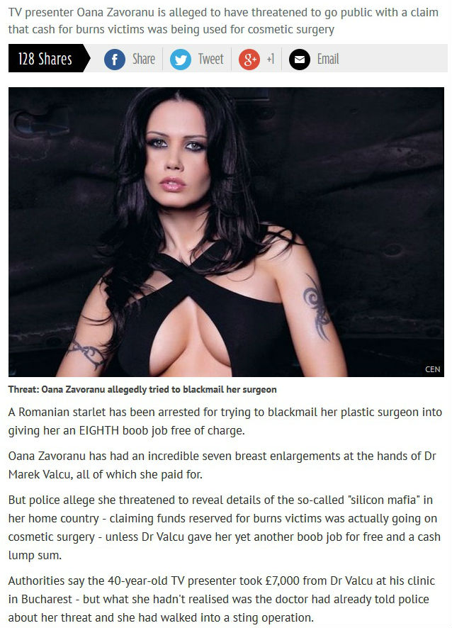 Potrivit mirror.co.uk, Oana Zăvoranu este o cunoscută prezentatoare TV din România, implicată într-un scandal cu medicul ei estetician, din cauza faptului că a fost extrem de nemulţumită de cele 7 operaţii cu implant de silicon pe care le-a suferit. La cea de-a 8-a operaţie, Oana a încercat să-l şantajeze pe Marek Vâlcu, însă a fost reţinută de poliţişti.