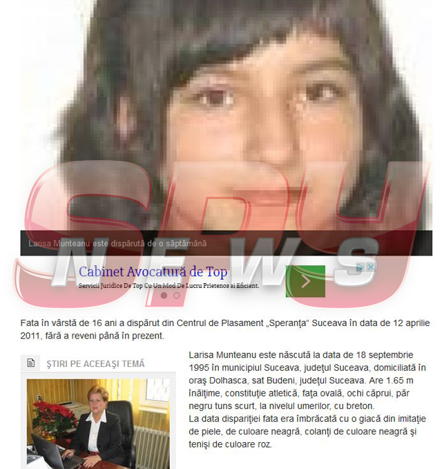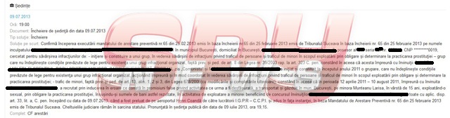 În schimb, a reapărut în evidențele poliției, într-un dosar amplu de prostituție care a fost instrumentat la Suceava. Astfel, Larisa a fost implicată, din postura de prostituată minoră în dosarul în care erau cercetați doi bărbați acuzați de exploatere sexuală și trafic de persoane. ”Învinuiţii (...) au iniţiat și constituit la începutul anului 2011 o grupare, care nu îndeplinește condiţiile prevăzute de lege pentru existenţa unui grup infracţional organizat, acţionând împreună și în mod coordonat în vederea săvârșirii de infracţiuni privind traficul de persoane și traficul de minori în scopul exploatării prin obligare și determinare la practicarea prostituţiei; - trafic de minori, faptă prev. și ped. de art. 13, alin. 1, 2 și 3, din Legea 678/200l (cu modificările și completările ulterioare), constând în aceea că în perioada 12 aprilie 2011 – 10 august 2011, împreună cu învinuita (...), a recrutat prin inducerea în eroare ce constă în promisiuni false privind activitatea ce urma a fi desfășurată, a transportat și găzduit în mun. București, pe minora Munteanu Larisa, în vârstă de 15 ani, exploatând-o sexual, prin obligare la practicarea prostituţiei, însușindu-și sumele de bani astfel rezultate, în activitatea de exploatare a minorei beneficiind de concursul învinuiţilor (...) toate cu aplic. disp. art. 33, lit. a, C. pen. începând cu data de 09.07.2013, când a fost preluat de pe aeroportul Henri Coandă de către lucrătorii I.G.P.R – C.C.P.I. și adus în faţa instanţei, în baza Mandatului de Arestare Preventivă nr. 65 din 25 februarie 2013 emis de Tribunalul Suceava. Cheltuielile judiciare rămân în sarcina statului. Pronunţată în ședinţa publică din data de 09 iulie 2013, ora 19,15”, se spunea în referatul procurorilor.