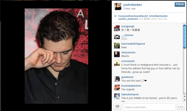 Acesta a postat pe o reţea de socializare o imagine în care Bloom îşi şterge lacrimile. După câteva minute, Bieber şi-a reconsiderat gestul şi a şters postarea, pe care a repostat-o ceea ce a atras şi mai mult atenţia asupra imaginii.