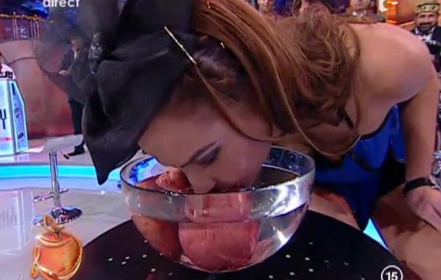 Frumoasa a apucat dintr-un bol plin cu apă un măr mare. Pentru că este noaptea de Moş Nicolae, Paula a dat curs provocării de la Un show păcătos şi a arătat cât de pricepută este.
