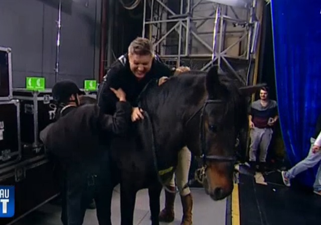 Întâi a sărit pe burtă pe cal, dar nu i-a ieşit, A doua oară, ca să fie sigur că reuşeşte, s-a urcat pe un scaun şi apoi pe cal, dar s-a rupt scaunul. Până la urmă, după mai multe încercări... dureroase, prezentatorul a încălecat.