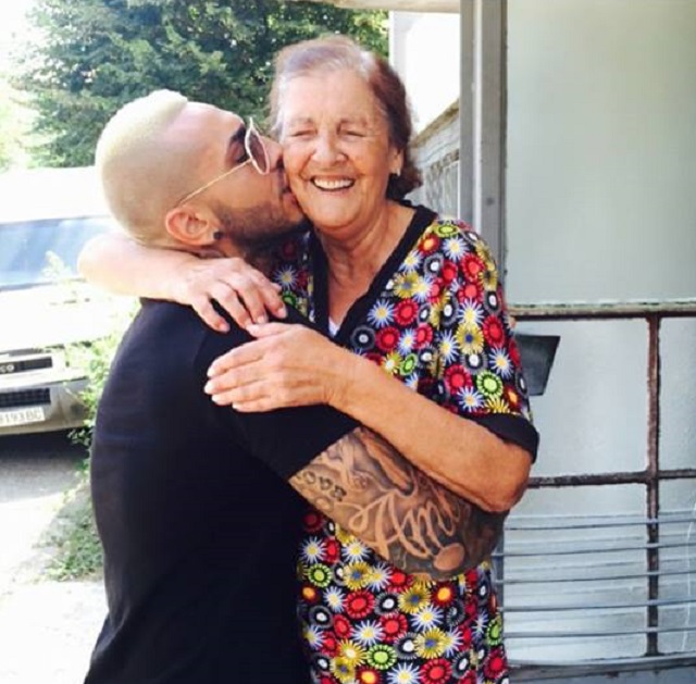 Se pare că artistul nu a uitat de unde a plecat, de aceea i-a făcut o vizită bunicii şi a imortalizat momentul. El a stâns-o în braţe şi a sărutat-o pe obraz. Bunica zâmbeşte larg şi se bucură de prezenţa nepotului ei drag. "Te iubesc, mamaie", scrie el la poza cu pricina.