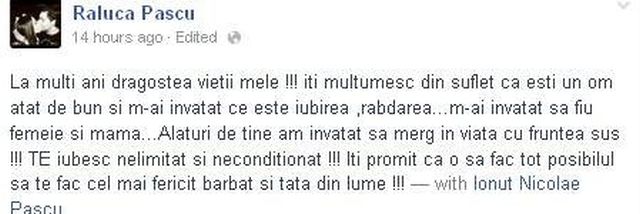 "La mulţi ani dragostea vieţii mele! Îţi mulţumesc din suflet că eşti un om atât de bun şi m-ai învăţat ce este iubirea, răbdarea, m-ai învăţat să fiu femeie şi mamă. Alături de tine am învăţat să merg în viaţă cu fruntea sus! TE iubesc nelimitat şi necondiţionat!!! Îţi promit că o să fac tot posibilul să te fac cel mai fericit bărbat şi tată din lume!!!", a scris Raluca Pastramă, seara trecută, pe Facebook.