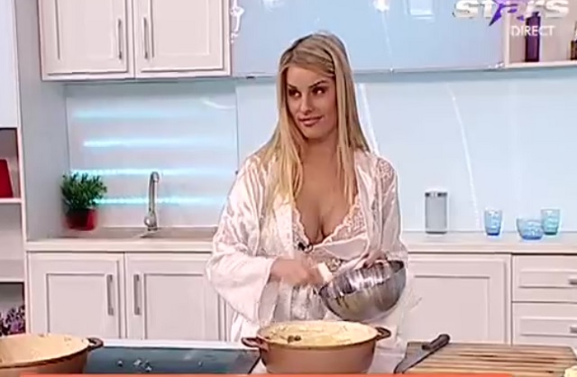 Florentina Raiciu nu s-a lăsat nici ea mai prejos. Îmbrăcată într-o cămaşă de noapte sexy, extrem de decoltată, asistenta nu s-a dezis de trebuie gospodăreşti şi s-a pus pe gătit musaca. La cât de bine arată, ne îndoim că domnilor le va păsa foarte mult de gustul preparatului.