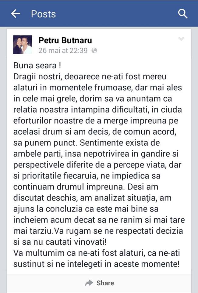 Din păcate, povestea de dragoste dintre ei doi s-a stins, la fel de repede cum a şi început. Petru şi-a anunţat fanii şi prietenii virtuali de decizia luată de comun acord cu Ana, aceea de a pune capăt relaţiei.