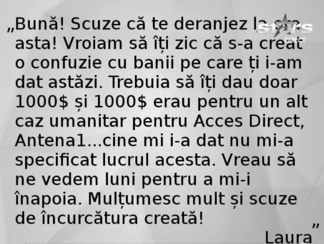 Artista susţine că nu s-a ocupat personal de plasarea sumei de bani, ci a trimis-o pe o prietenă d-ale ei pentru a îi da, iar aceasta nu a înţeles că cei 5000 de euro erau destinaţi mai multor cazuri umanitare. Când a aflat de confuzie, prietena cântăreţei i-a trimis un sms Lidiei, fata mai mare a lui Corneliu Vadim Tudor pentru a îşi ceară scuze.
