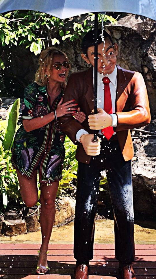 Cântăreaţa profită la maximum de zilele de concediu. După ce a făcut plajă, s-a bălăcit în mare şi şi-a făcut poze în ipostaze tandre cu soţul său, blonda a schimbat un pic programul de vacanţă şi s-a dus să-l întâlnească pe... Mr. Bean. Când l-a găsit, l-a luat cu tupeu de braţ şi s-a lăsat fotografiată aşa. Este vorba de un Mr. Bean din plastic, care imită perfect postura şi expresia feţei celebrului personaj.