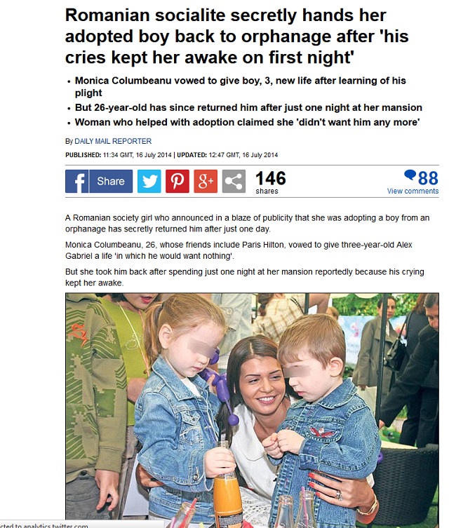 Monica Gabor a intrat în vizorul presei internaţionale cu o ştire care nu-i face deloc bine imaginii publice. Daily Mail scrie că fosta doamnă Columbeanu a spus că adoptă un băieţel dintr-un orfelint, dar după o zi l-a dus înapoi la casa de copii.