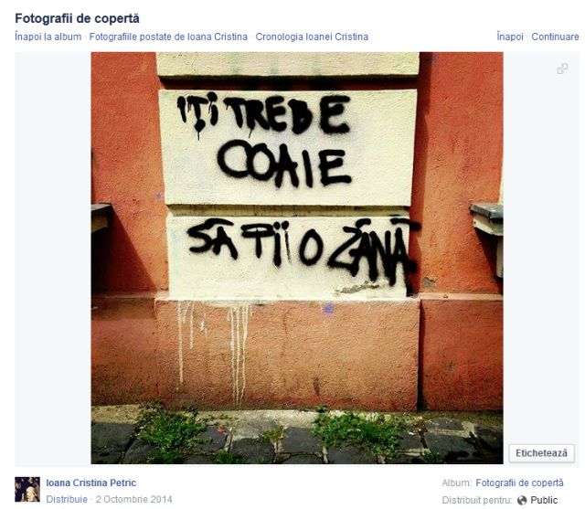 Ioana Cristina Petric, prezentatoarea emisiunii "Cronica Cârcotaşilor", de la Prima TV, a postat pe Facebook o fotografie în care evidenţiat un mesaj obscen. Deşi este moderatoarea celei mai cârcotaşe emisiuni, căci toate vedetele tv sunt taxate când greşesc în timp ce prezintă ştirile sau cum sunt surprinse pe stradă, Ioana s-a gândit că este privilegiată, căci de ea n-are cine să se ia. Însă, iată, a gafat şi noi am prins-o.