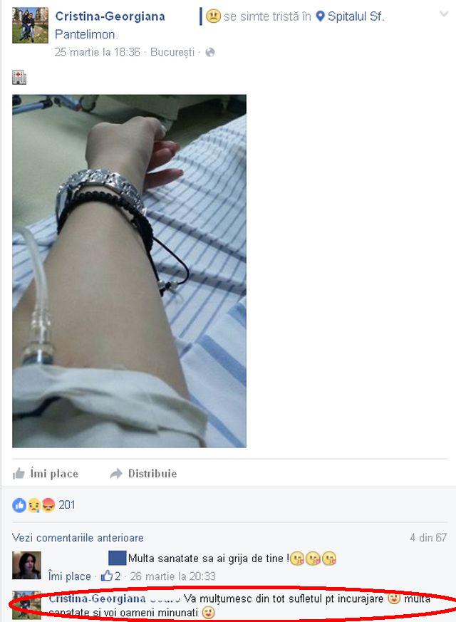 După ce şi-a revenit din anestezie, Cristina a postat pe internet un mesaj prin care le mulţumeşte celor care s-au gândit la ea şi le urează sănătate.