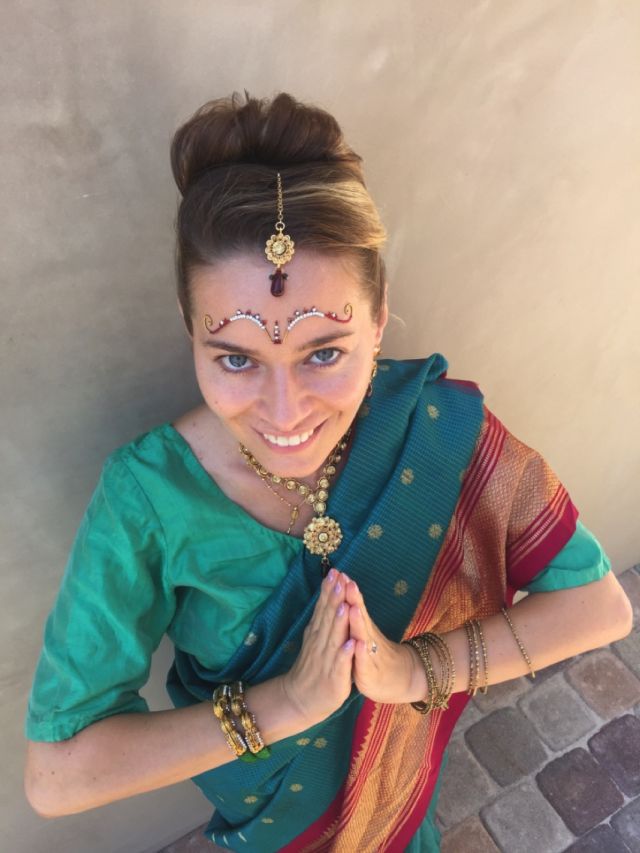 "Iata-mă mireasă! :) În LA am locuit la prietenii lui Cosmin, o familie absolut superbă, el roman,, ea indiancă. Duminică dimineaţa ne-am trezit, am repetat dansul mirilor (pregătit de mama),, am mâncat pranz indian şi Kavita mi-a împrumutat sari-ul şi accesoriile tradiţionale, costumându-mă astfel în mireasă indiancă. A fost o surpriză foarte frumoasă pentru Cosmin! Pânp îmbrac rochia albă iată-mă în varianta colorată! :)", a scris vedeta pe blogul personal.