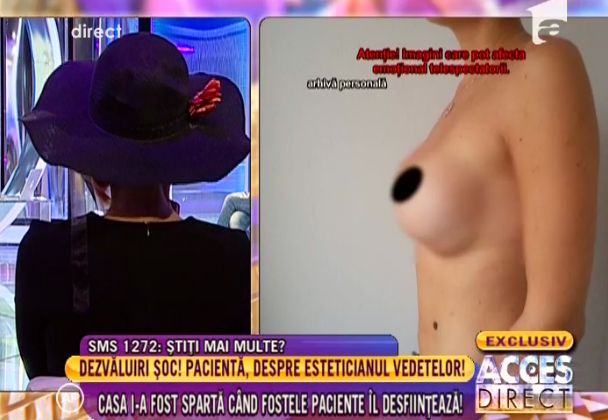 "M-am operat în aprilie 2012, iar a doua zi m-a extrenat. Am făcut infecţie, în curgea lichid de sub sânul drept. Imaginile cred că spun totul. Am fost operată din nou de un alt medic. Toată 'distracţia' m-a costat 6.500 de euro", a spus fosta pacientă a lui Kasem.