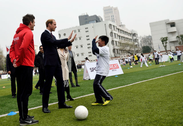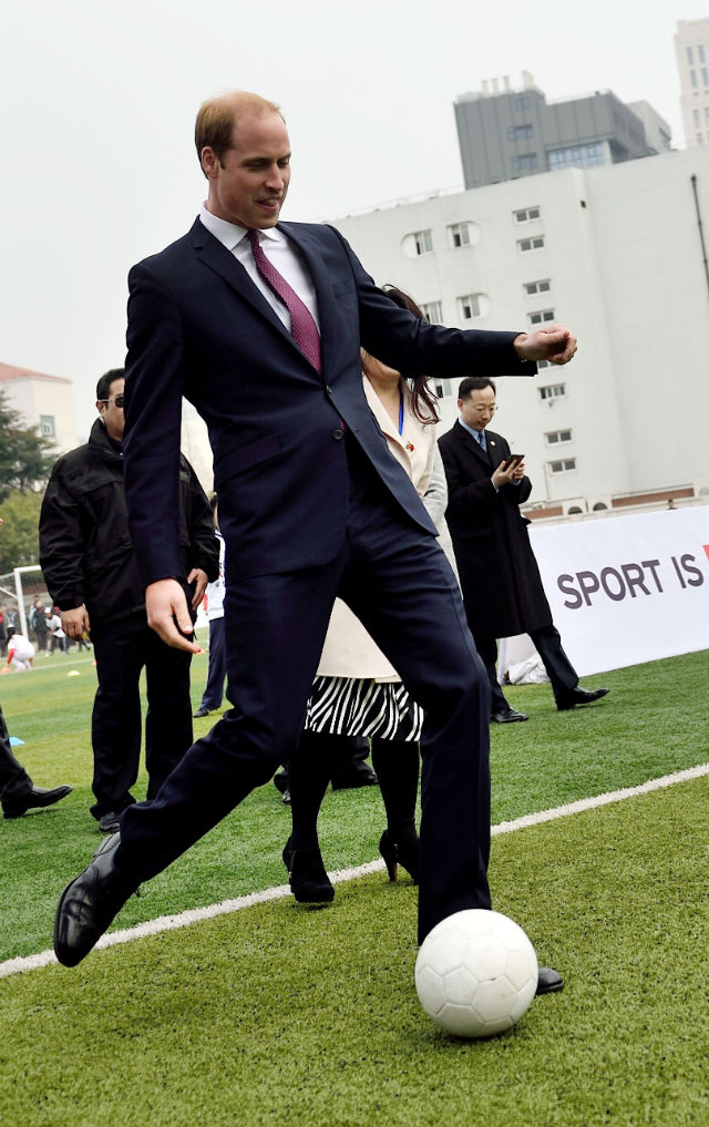 Astăzi, în timp ce se afla pe un teren de sport din Shanghai, Prinţul William nu a rezistat tentaţie unei mingi de fotbal. Şi, deşi era îmbrăcat într-un costum elegant, cu cravată şi pantofi, fiul cel mare al Prinţului Charles și al Prinţesei Diana a lovit mingea ca un fotbalist profesionit, spre surprinderea tuturor.