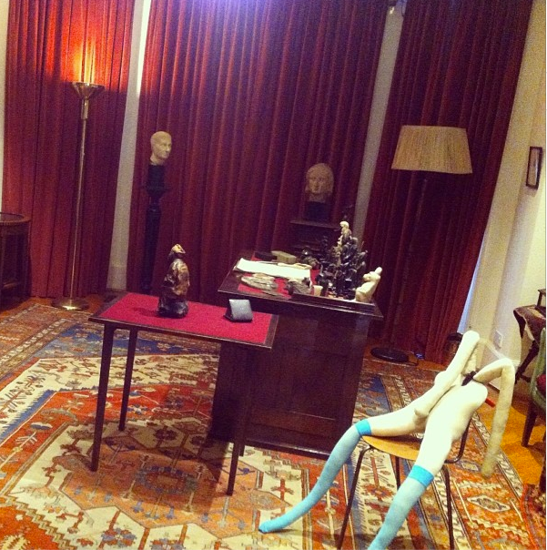 În mijlocul încăperii,pe un scaun, se afla poziţionat un mulaj ce înfăţişa un corp de bărbat, îmbrăcat în port-jartier!