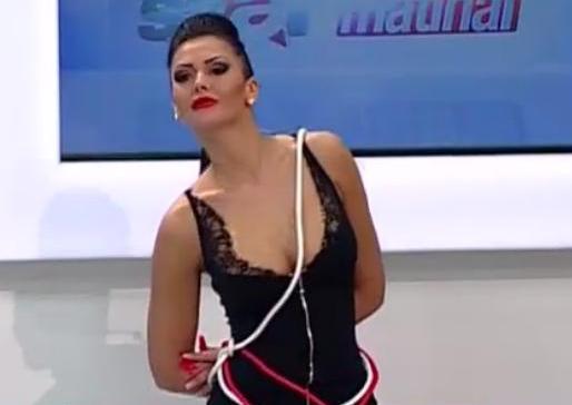 Fără prea multe explicaţii, Răzvan Botezatu a pedepsit-o pe senzuala Raluca. Acesta a legat-o cu funie de scaunul de unde bruneta prezinte rubrica meteo.
