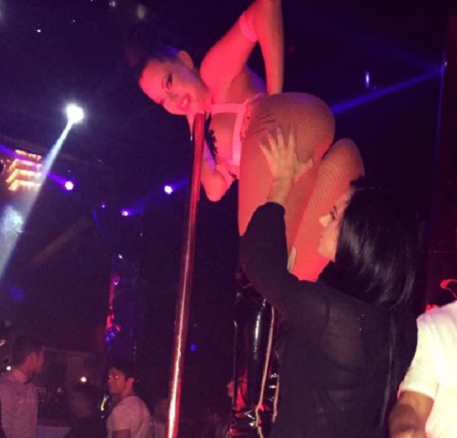 Raluca Dumitru şi-a postat pe contul de socializare o fotografie din club, de seara trecută. Bruneta nu era îmbrăcată provocator, ci casual, într-o pereche de blugi şi o cămaşă vaporoasă, neagră. Se pare că mai provocator a fost gestul pe care l-a făcut Raluca, atingând posteriorul bombat al unei animatoare.