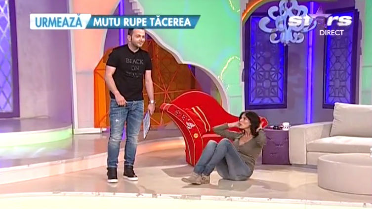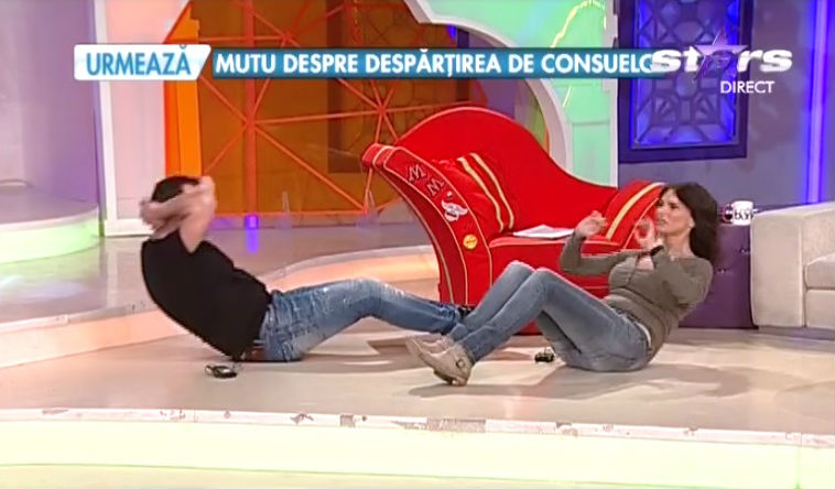 Fără niciun pic de reţinere, ea a refuzat să se aşeze pe canapeaua invitaţilor şi s-a pus direct pe podea, moment în care s-a apucat să facă abdomene. Ramona l-a luat şi pe Mihai şi l-a convins să facă exerciţii fizice alături de ea.