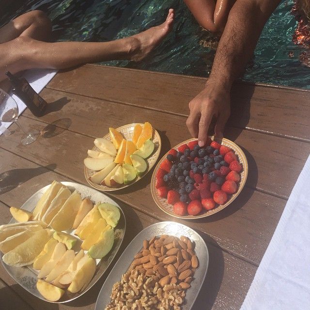 La piscină a avut numai platouri cu fructe proaspete, de la mere, portocale şi căpşuni, la fructe uscate - migdale şi nuci, care să îi dea necesarul de energie, însă fără să o îngraşe.