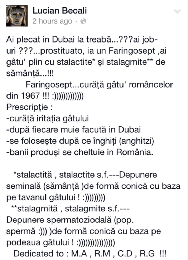 Lucian Becali nu le agreează deloc pe frumoasele showbiz-ului românesc care, spune el, au devenit peste noapte celebre în "Emirate". "Ați plecat în Dubai la treabă?! Prostituatelor! Luați un faringosept!", a scris el, pe contul lui de socializare. Şi aceasta este doar o parte dintr-un lung mesaj în care nepotul lui Becali foloseşte cuvinte nu tocmai ortodoxe pentru a le lua peste picior pe fete.