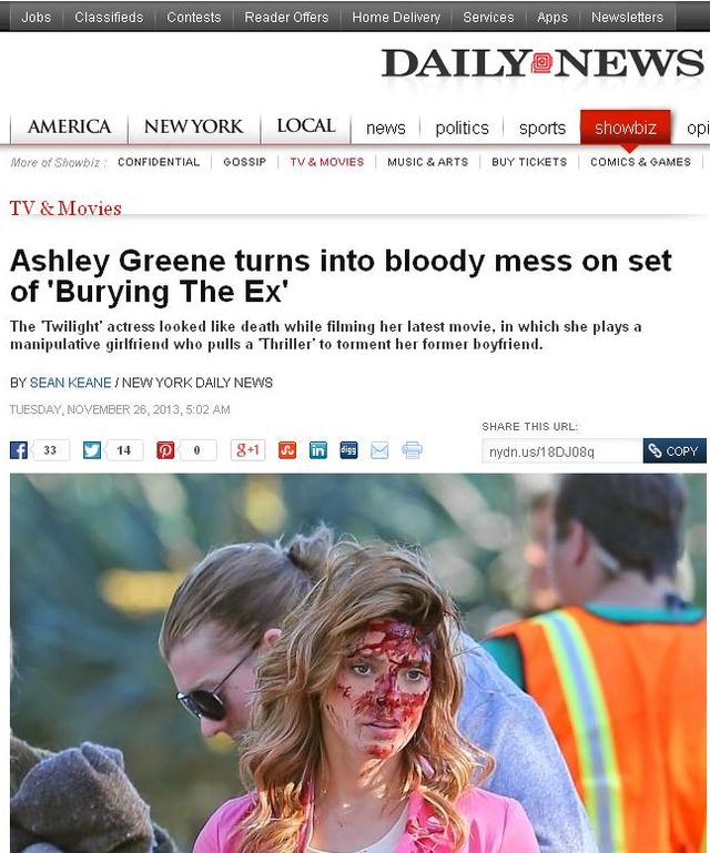 Ashley Green a fost surprinsă în timp ce se afla pe asfalt într-o baltă de sânge şi rănită. Totul s-a întâmplat în timpul filmărilor pentru filmul "Burying the Ex", unde actriţa joacă rolul unei femei care vrea să-şi distrugă iubitul, însă moare într-un accident de maşină. Ashley a fost atât de bine machiată, încât oamenii aflaţi acolo au crezut că totul este real, potrivit nydailynews.com