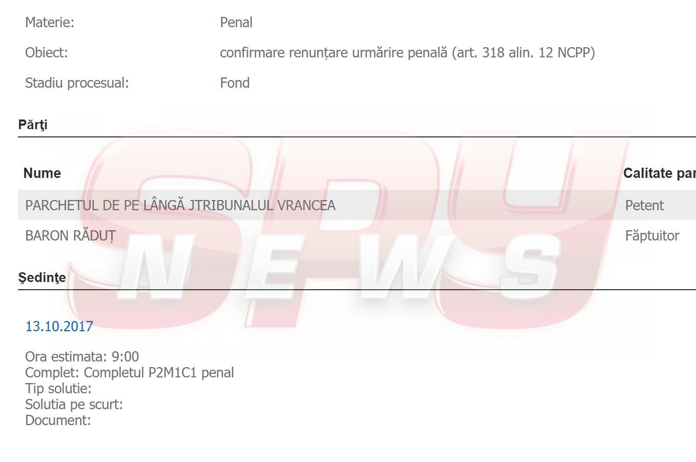 Parchetul de pe lângă Tribunalul Vrancea a deschis, zilele trecute, un proces la Judecătoria Focşani, în care Radu Baron are calitatea de făptuitor, într-o încercare disperată de a clasa dosarul în care impresarul este acuzat de înşelăciune. Deşi, în mod normal, procurorii sunt cei care se zbat să bage infractorii la răcoare, în cazul lui Baron anchetatorii vrânceni au ajuns la concluzia că nu are sens să îl trimită în judecată pe impresar, deoarece prejudiciul este prea mic: 800 de euro. "În cazul infracţiunilor pentru care legea prevede pedeapsa amenzii sau pedeapsa închisorii de cel mult 7 ani, procurorul poate renunţa la urmărirea penală când, în raport cu conţinutul faptei, cu modul şi mijloacele de săvârşire, cu scopul urmărit şi cu împrejurările concrete de săvârşire, cu urmările produse sau care s-ar fi putut produce prin săvârşirea infracţiunii, constată că nu există un interes public în urmărirea acesteia", este articolul invocat de procurorii miloşi.
