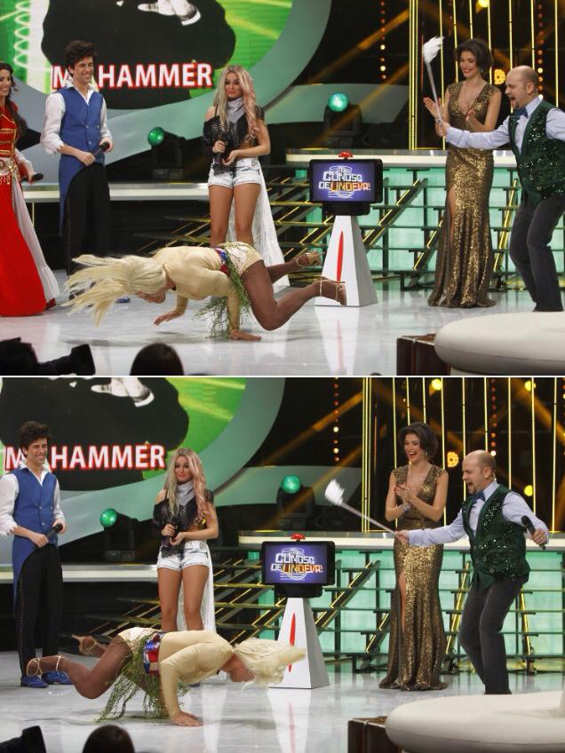 Cântăreţul s-a pus în mâini şi a început să facă mişcări de breakdance, fără să ţină cont de faptul că era îmbrăcat într-un body auriu, dresuri de femeie şi sandale cu toc. Peruca sa blondă a stat mai mult în aer cât timp el a dansat, spre amuzamentul tuturor telespectatorilor.