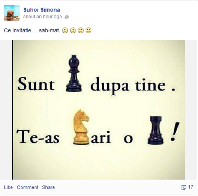 "Sunt nebună după tine. Te-aş călări o tură", a îndrăznit Simona să scrie, nu direct, ci cu ajutorul unor piese de şah cu care face aluzie la câteva dintre cuvintele din acest mesaj. Bărbaţii cu care este ea prietenă pe Facebook i-au mărturisit imediat că acceptă invitaţia.