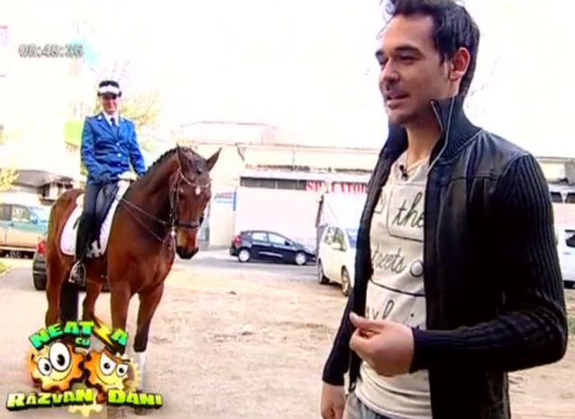 Răzvan Simion şi-a lăsat colegul de prezentare, pe Dani Oţil, singur în platoul emisiunii, pentru câteva minute. Răzvan a fost nevoit să meargă în curtea televiziunii, de unde a prezentat un invitat mai special: un cal ce aparţine Jandarmeriei Române.