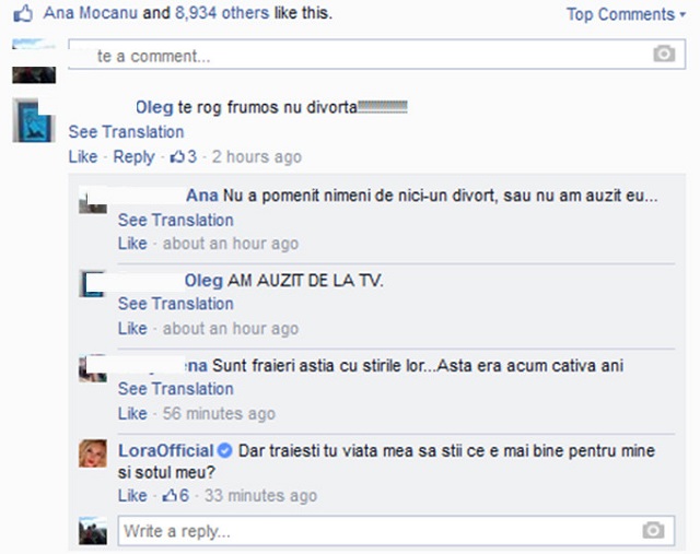 La auzul zvonurilor despre separare, prietenii virtuali i-au scris artistei pe Facebook. Cea mai mare parte dintre ei au sfătuit-o să nu divorţeze. "Dar trăieşti tu viaţa mea să ştii ce e mai bine pentru mine şi soţul meu?", a fost reacţia Lorei la comentariile fanilor.