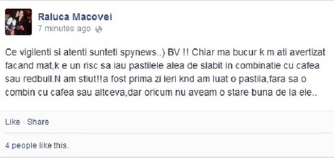 După ce spynews.ro a publicat fotografia bombă în care apare dovada dietei periculoase pe care bruneta o urmează, Raluca Macovei reacţionează. Prietena Oanei Zăvoranu susţine că nu ştia că această combinaţie îi poate fi fatată! Hmm, aşa să fie oare?