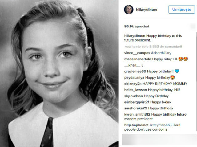 Copila din poza alb-negru e Hillary Clinton, care împlineşte astăzi 69 de ani. Cu mai puţin de o lună înainte ca americanii să meargă la vot, candidata democrată rămasă în cursa pentru fotoliul de la Casa Albă şi-a făcut singură o urare atunci când a urcat pe Instagram fotografia de colecţie.
