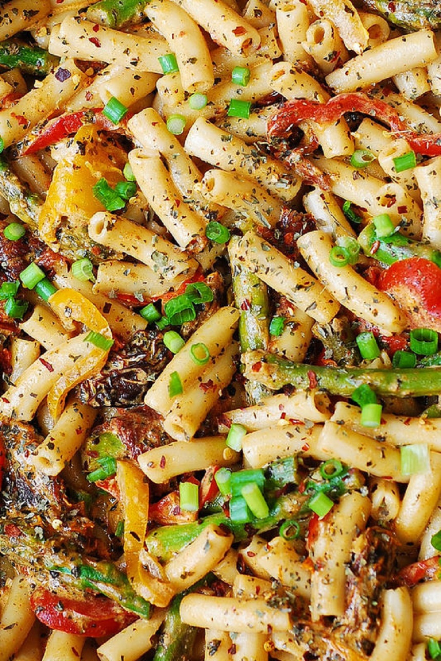 Se încălzeşte o tigaie la foc mare şi se adaugă două linguri de ulei, usturoi şi roşii uscate. Căliţi totul taproximativ un minut, iar apoi adăugaţi restul legumelor şi se lasă la fiert timp de 2-3 minute. Într-o oală mare se pun pastele la fiert, conform instucţiunilor de pe pachet. Când sunt gata se scurg şi se clătesc cu apă rece. Adăugaţi pastele peste legume şi lăsaţile la fiert tip de un minut până când se topeşte parmezanul, iar sosul devine cremos. La final se adaugă o lingură de busuioc şi 1/4 linguriţă de boia de ardei, se amestecă pentru ca toate ingredientele să se combine perfect.