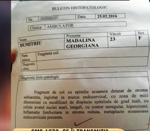 Iată rezultatul biopsiei, la care Beyonce încă nu are decât o interpretare în termeni medicali: "Fragment de col cu epiteliu scuamos detaşat de stoma subiacentă, înglobat în mucus endocervical, cu zona de mici dimensiuni cu modificări de displazie epitelială de grad înalt, cu celule având nuclei mari, inegali, cu contur neregulat, hipercromi. Inflamaţie limfocitară în stroma redusă, metaplazie scuamoasă endocervicală prezentă."