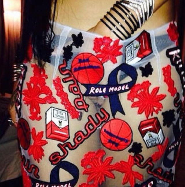 Îmbrăcată într-o fustă transparentă, cu inserţii diverse şi uşor ironice, căci cuvântul "model" apare de mai multe ori pe piesa vestimentară, alături de frunze de marijuana sau ţigări, Rihanna şi-a scandalizat prietenii virtuali. Artista şi-a postat pe contul de Twitter o fotografie în care se atinge în zona intimă.