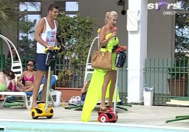 Rocsana Marcu şi Răzvan Botezatu şi-au făcut intrarea în emisiune de astăzi, fiecare, "călare" pe câte un "Robstep". Carismaticii prezentatori s-au plimbat în jurul piscinei ce găzduiesc emisiunea. Ba chiar, vântul i-a dat bătăi de cap Rocsanei ridicându-i rochiţa extrem de sex şi vaporoasă.