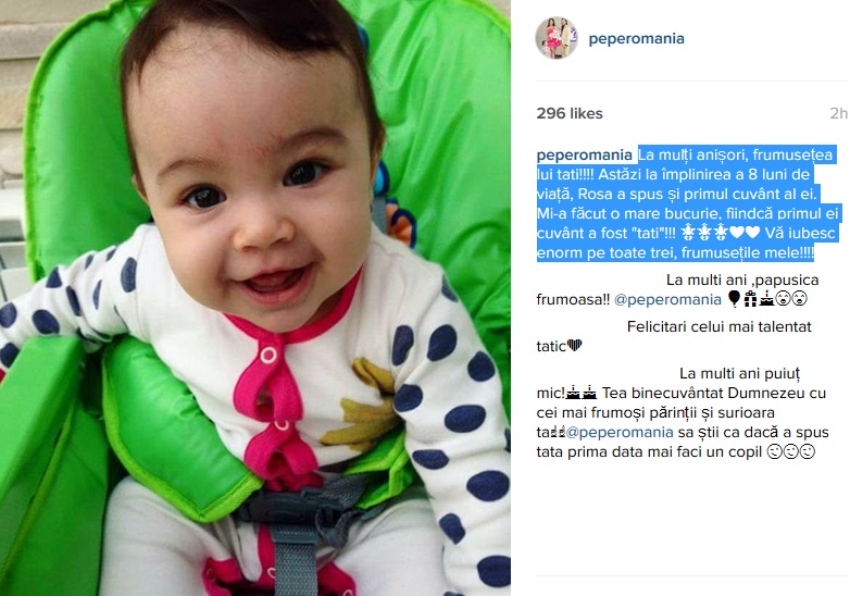 "La mulți anișori, frumusețea lui tati! Astăzi la împlinirea a 8 luni de viață, Rosa a spus și primul cuvânt al ei. Mi-a făcut o mare bucurie, fiindcă primul ei cuvânt a fost "tati"! ❤❤ Vă iubesc enorm pe toate trei, frumusețile mele!", este mesajul care însoţeşte imaginea cu Rosa Alexandra postată de Pepe pe o reţea de socializare.