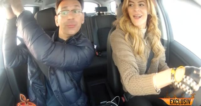 Cei doi s-au plimbat cu noua maşină a Roxanei. Reporterul a fost scuturat de frică din cauza manevrelor bruşte pe care le-a făcut frumoasa blondă.