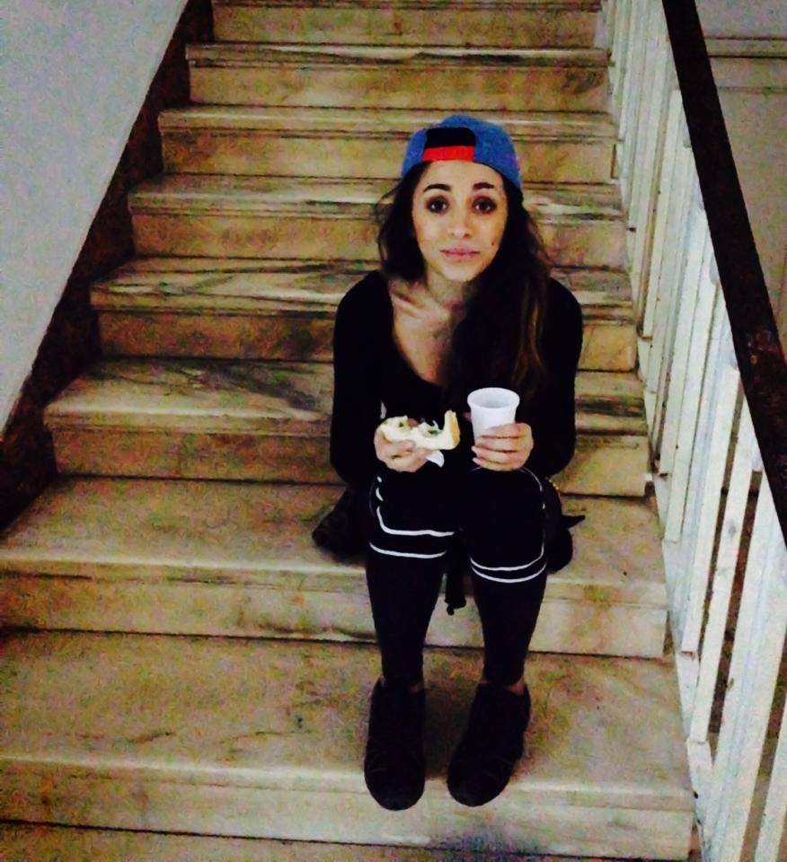 Îmbrăcată sport, în haine închise şi cu o şapcă albastră în cap, Ruby a ales să ia o gustare pe scări. Cu sandwich-ul într-o mână şi cu un pahar din plastic în cealaltă, cântăreaţa aruncă o privire tâmpă în obiectiv. La o asemenea ipostază nu ne-am mira dacă cineva i-ar "dona" apetisantei brunete o monedă sau două, pentru o cafea de la automat. Ruby, s-au dus zilele bune?