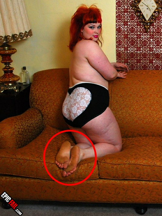 Domnişoara din imagini s-a gândit să-şi facă o şedinţă foto pe canapea, aşa că, fără să stea prea mult pe gânduri, s-a apucat de treabă. S-a aranjat cu mare grijă, s-a machiat, s-a rujat, însă ce se vede mai jos de cap nu putem spune că este cea mai inspirată alegere. Tânăra şi-a luat o pereche de chiloţi XXL cu model din dantelă la spate, model în formă de inimioară. Ce nu înţelegem însă, făcând abstracţie de picioarele groase, este cu ce oare şi-a asortat praful de pe talpă...