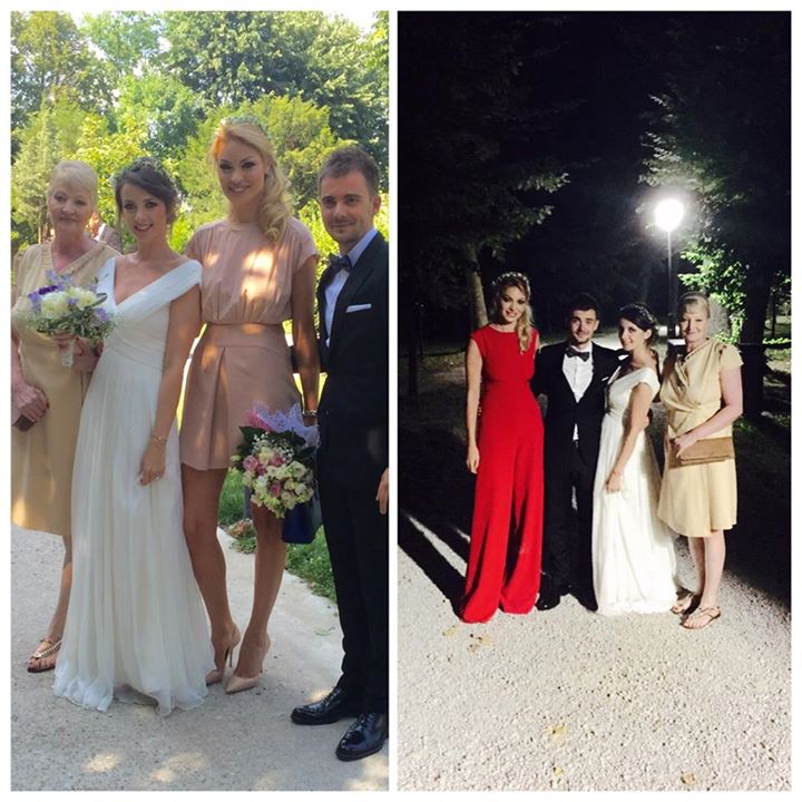 Ea a postat pe pagina personală de Facebook două fotografiiii cu familia, în care se pot observa rochiile. Una dintre ele de un roz pal şi scurtă, purtată la cununia religioasă şi cealaltă roşie şi lungă, purtată la petrecere.
