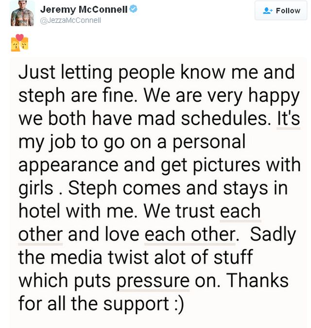 "Am vrut ca lumea să ştie că lucrurile între mine şi Steph sunt bune. Suntem amândoi foarte fericiţi şi ne-am făcut planuri. Este job-ul meu să apar în fotografii alături de alte fete în ipostaze personale. Steph vine şi stă în hotel cu mine. Avem încredere unul în celălalt şi în iubirea noastră. Este trist că media pune presiune pe noi. Vă mulţumim pentru suport", le-a spus şi Jeremy McConnell prietenilor lui, infirmând ipoteza despărţirii.