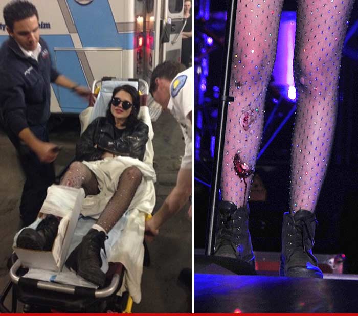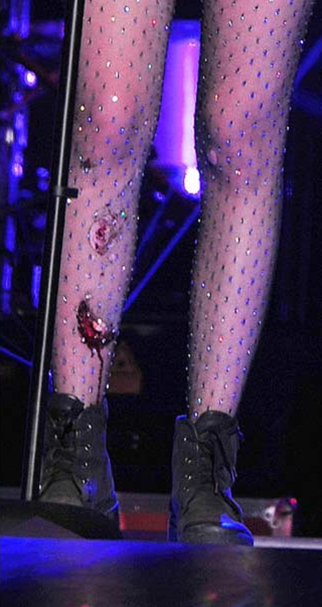 Este vorba despre Sky Fereira. Cântăreaţa a cântat în acelaşi concert cu Miley Cyrus. Se pare că artista s-a împiedicat şi a căzut încă din timpul primei melodii, însă nu a renunţat, cu toate că sângele îi curgea şiroaie pe picioare. După concert, Sky a primit îngrijirile medicale corespunzătoare.