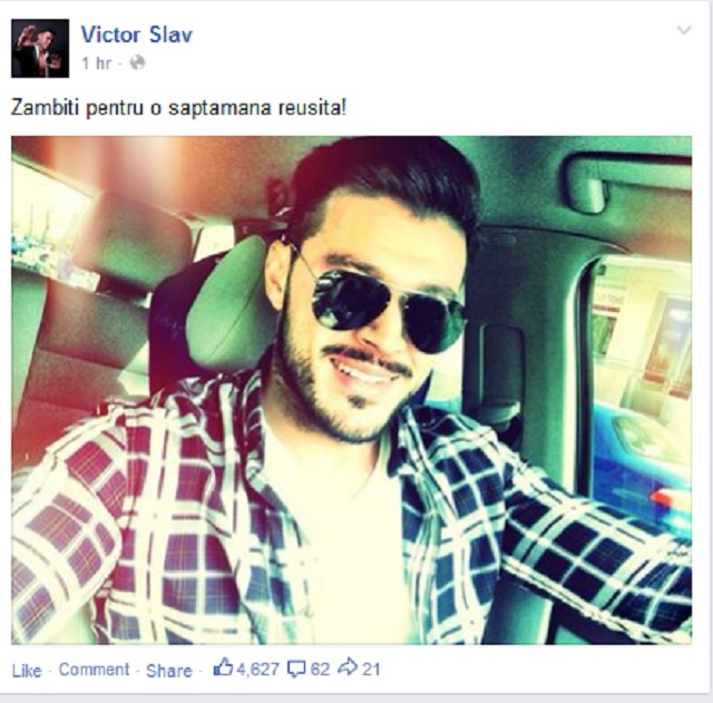 Cu barbă şi mustaţă mai mari ca de obicei şi cu cămaşa descheiată, Victor Slav s-a fotografiat la volanul maşinii sale, zâmbind larg. Prezentatorul de la meteo le-a transmis fanilor să zâmbească, pentru că aşa vor avea o săptămână fumoasă. Se pare că noul look este pe placul admiratoarelor sale, care l-au lăudat în comentarii pe contul lui de socializare. "Eşti un frumos şi un superb", i-a scris una dintre ele.