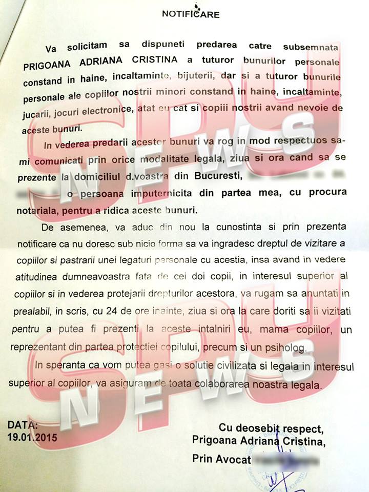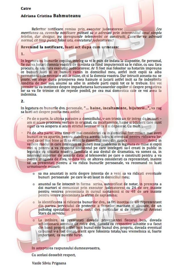 - Pe de altă parte, atâta timp cât mai considerați că în domiciliul fost comun mai aveți bunuri ce vă aparțin, pentru stabilirea acestui lucru și eventual pentru ridicarea lor, cred că cel mai bine ar fi să veniți la domiciliul meu. (...) Înainte să vă prezentați pentru a vă ridica bunurile personale, vă recomand să luați următoarele măsuri: să mă anunțați în scris despre intenția de a veni să vă ridicați eventuale bunuri persoanale pe care le-ați lăsat în domiciliul meu; anunțul să fie întocmit în formă scrisă, autentificat de notar, în prezența a doi martori și comunicat prin executor judecătoresc cu 24 de ore înainte pentru venirea preconizată în cursul săptămânii și cu 48 de ore înainte pentru venire preconizată la sfârșit de săptămâna; la identificarea și ridicarea bunurilor dvs să fiți însoțită de un reprezentant din partea serviciului de protecție a femeilor măritate și abuzate, de un psiholog specializat pentru cazul dvs. particular și de reporterul Antenei Stars de serviciu. La întâlnire, să prezentați dovada provenienței fiecărui bun, dovada achiziționării acestuia de către dvs., dovada că respectiva achizitie s-a făcut din banii proprii astfel încât bunul este bunul dvs. propriu, dovadă eventual că bunul v-a fost donat, oferit spre folosință totalăsau vremelnică și, foarte important, că nu este furat“, mai specifică Silviou Prigoană în scrisoarea destinată Adrianei Bahmuțeanu.